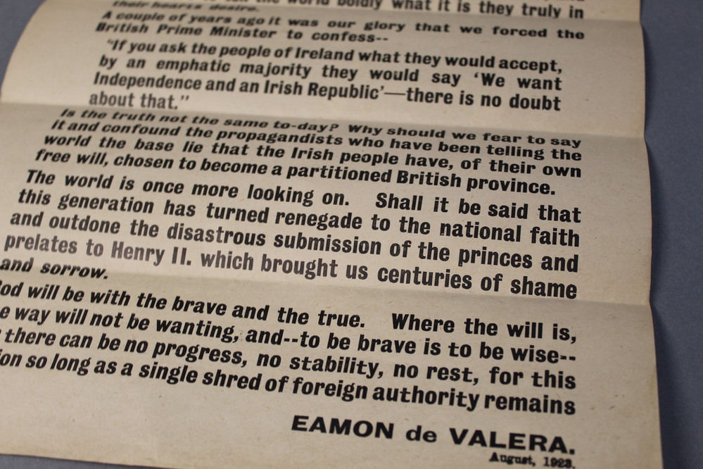 Printed Sinn Fein Election Manifesto poster, detailing the Anti-Treaty policy of the party, text credited to Eamon de Valera. Opening of manifesto reads: